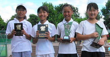 14才以下女子(於:青葉の森、7/29)![]() 左から、 優勝:服原 令佳(TAC)さん 準優勝:松井 彩花(Aーone)さん 3位:福田 聡子(殿山TG)さん 4位:野澤 茉莉子(Aーone)さん(表彰式欠席) 台風が日本の南岸に接近した影響で、ざーざー降りになったと思ったら また青空が現れるという選手泣かせの天気の中行われた。 SF1 福田 聡子(殿山TG) 2−6 松井 彩花(Aーone) フォアとバックのストロークに安定感のある2人の対戦。 福田さんのサービスが乱れる、松井さんの両手打ち フォアハンドコーナー深く打ち込まれる。 福田さん、「納得できるプレーだった」が惜敗。 SF2 野澤 茉莉子(Aーone) WO 服原 令佳(TAC) 相手WOにより服原さん決勝へ! 決勝 松井 彩花(Aーone) 1−6 服原 令佳(TAC) 松井さんは両手打ちフォアで、服原さんは両手打ちバックで 気力溢れるラリーの応酬! 服原さんがラリーの中で強弱をつけて次第に相手のミスを誘う。 マッチポイントを、ネットに詰めてボレーで決める。 そんな攻めのテニスでうれしい優勝! |